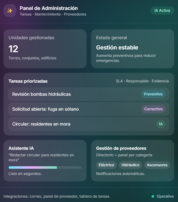 Pensado para el día a día real: moras, emergencias, proveedores, asambleas y control del plan maestro de mantenimiento.